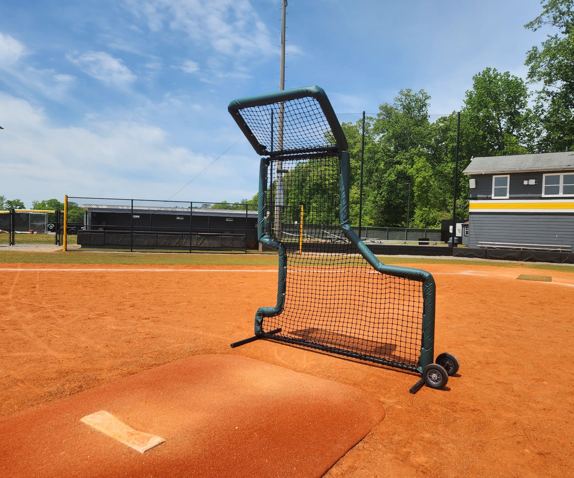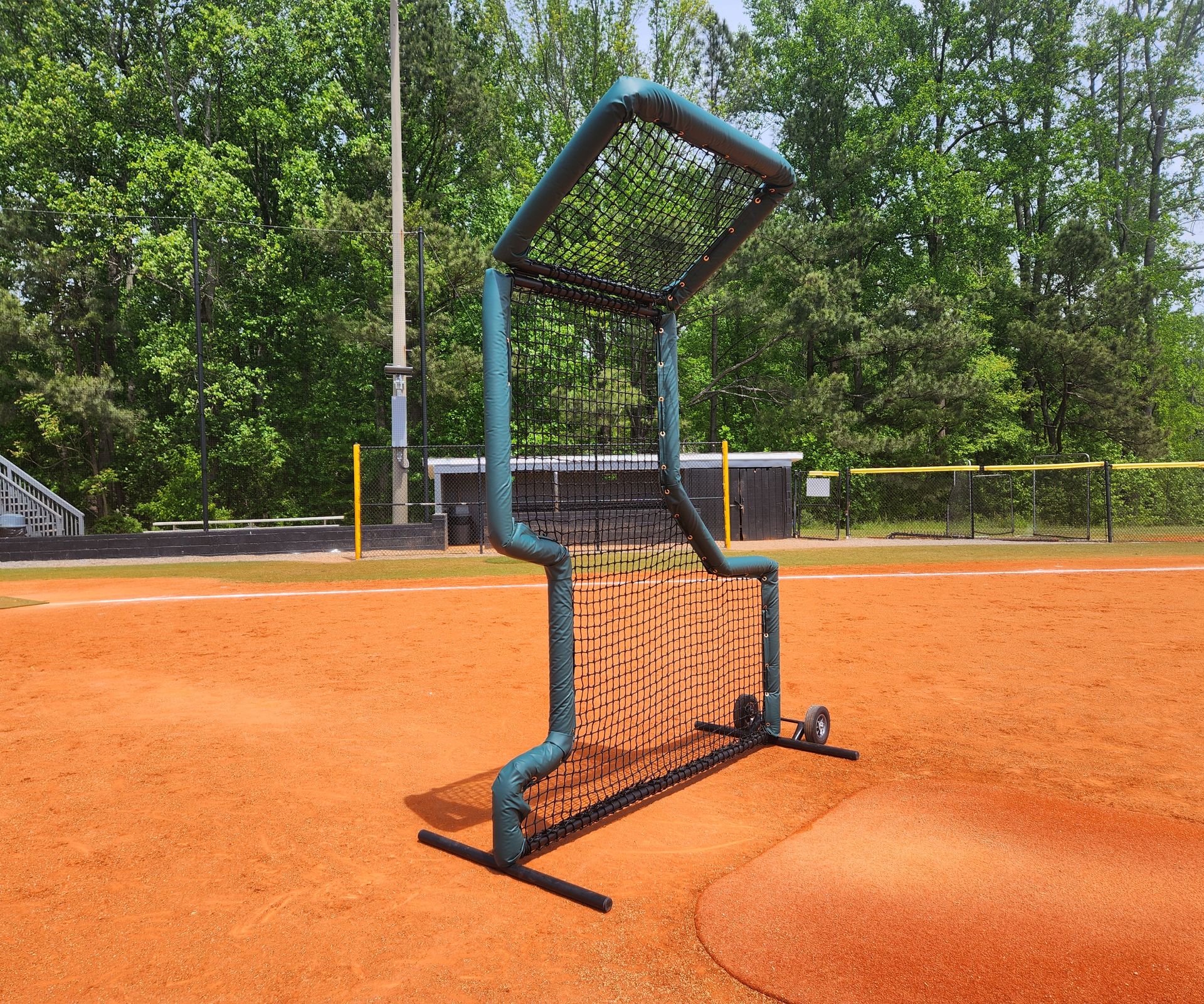 This protective training screen features a flip overhead for added safety during overhand and front toss drills. Built with a durable single welded frame and equipped with wheels for easy mobility, it’s designed for reliable performance and frequent use. Available in multiple color options.