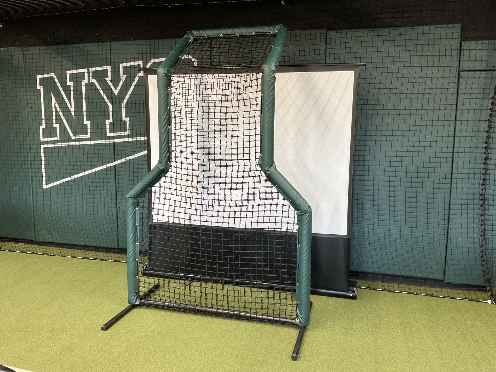 This double-sided screen is perfect for front toss practice. It features dual side cutouts for left- and right-handed hitters and an overhead protector for added safety.